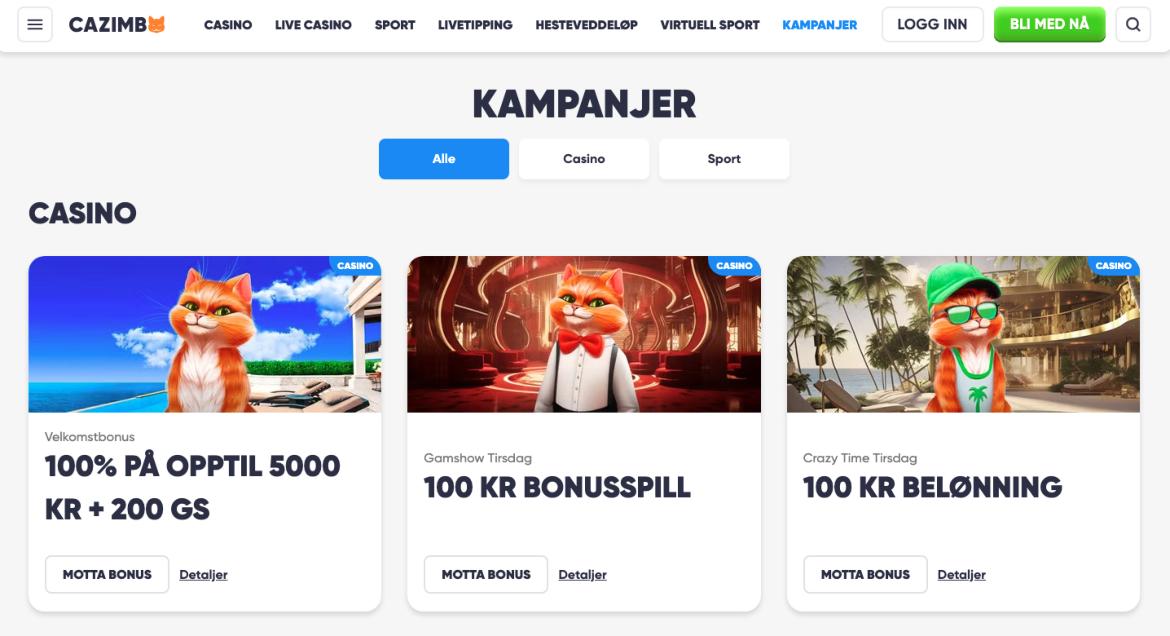 - Casino Bonus: Her får du 100 % bonus opptil 5000 kroner, og minste innskudd er på 200 kroner. I tillegg til dette får du også 200 free spins på populære spilleautomater hos Cazimbo.